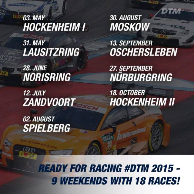 KDX为各位准备了2015年DTM的赛事安排,有兴趣的朋友可以随时关注,KDX也会第一时间为各位奉上精彩片段!